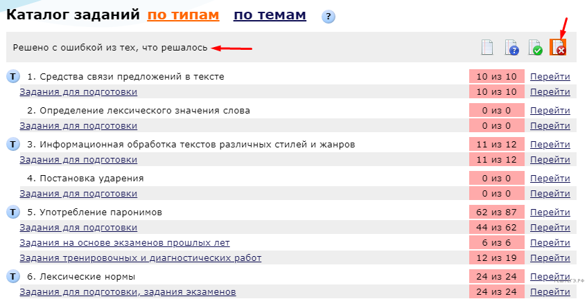 Такой сер­вис есть: в ка­та­ло­ге за­да­ний есть кноп­ка (от­ме­ти­ли на скрин­шо­те ниже). Она поз­во­ля­ет от­крыть за­да­ния, ко­то­рые ре­ша­лись, но в ко­то­рых были до­пу­ще­ны ошиб­ки. Но лучше ре­шать пер­со­наль­ные ва­ри­ан­ты с глав­ной стра­ни­цы: в них будут за­да­ния, в ко­то­рых вы до­пус­ка­ли ошиб­ки, пра­виль­но на­стро­ен­ное до­бав­ле­ние ранее не­ре­шен­ных за­да­ний и т. д.